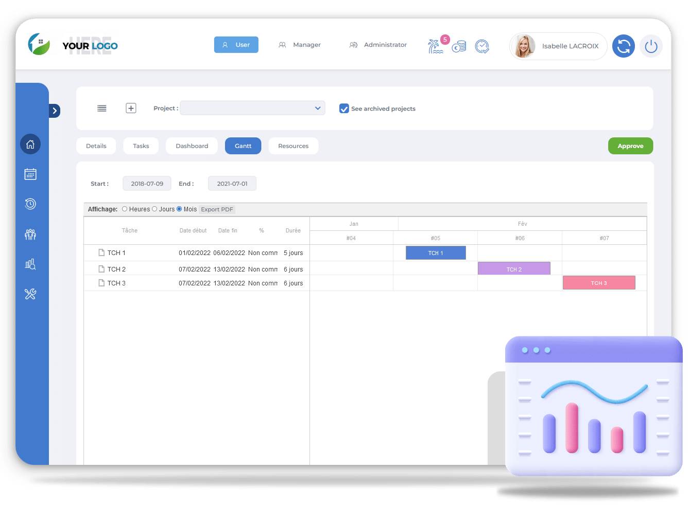 Plan your resources, organize, manage ! Manage your projects with ease, centralise your actions, prioritize your tasks, monitor and analyse the evolution of your projects to better organize your activity and your teamwork.