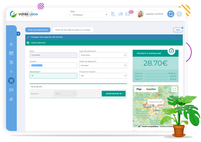 L’utilisateur n’aura alors qu’à renseigner l’adresse de départ, l’adresse d’arrivée et la puissance fiscale de son véhicule. Le système calculera automatiquement la note de frais (kilomètres parcourus, indemnités totales). Le plan du trajet via google maps sera automatiquement affecté à la note de frais.